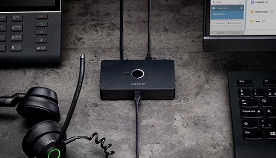 This clever little device can connect any Jabra USB headset to both your computer and desk phone. You can use it with a USB-C corded headsets.